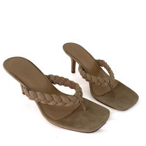 $295 Veronica Beard Marissa Heel Sandal 7M Suede Square Thong Toe Braided Strap