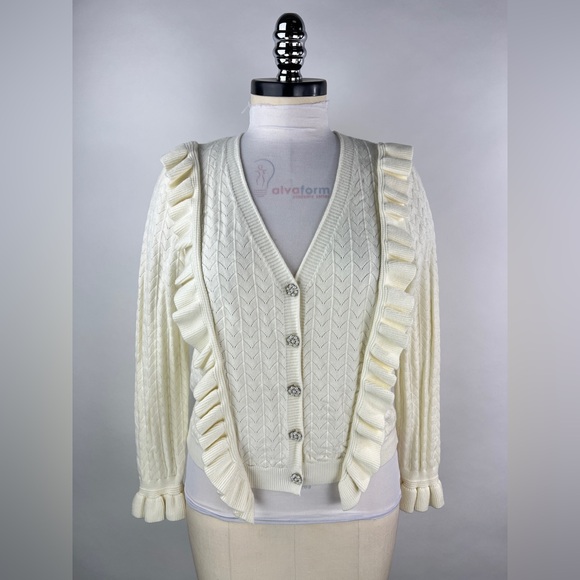 Soft Ruffled Button Front Cream Cardigan with elegant embellished pearl rhinestone buttons.