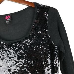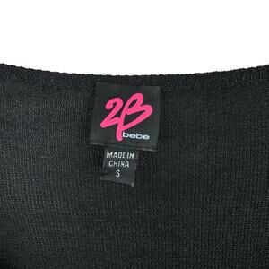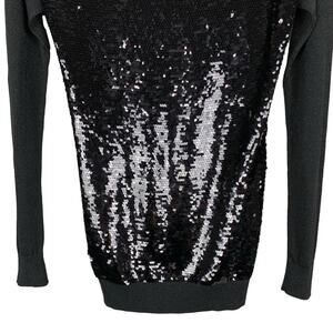 2B Bebe black sweater in women's size small. Sequin covered front. Lightweight, stretchy knit. Slightly sheer. Long sleeves. Missing fabric/care tag. Great condition!