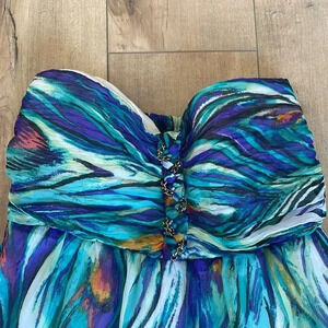 2B Bebe Strapless Sweetheart Peacock Hi-Lo Dress Sz S