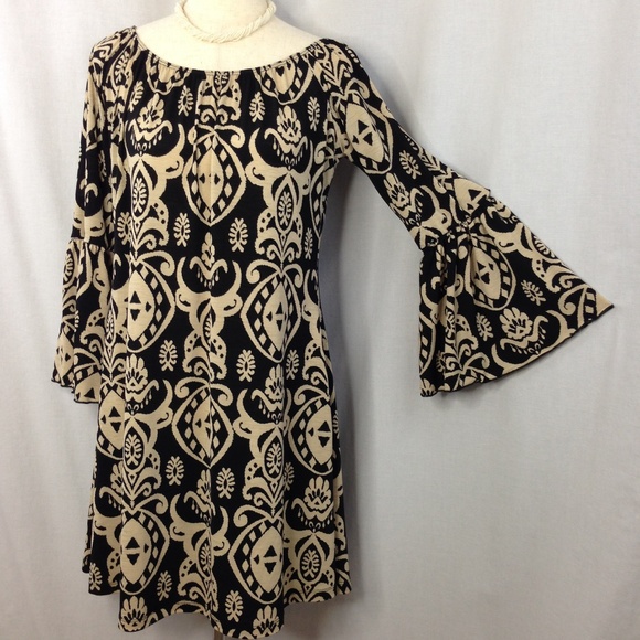 2B Together Ikat Bell Sleeve Stretch Dress - black and tan graphic print - great dress for traveling - does not wrinkle! - gently worn - no holes or stains