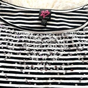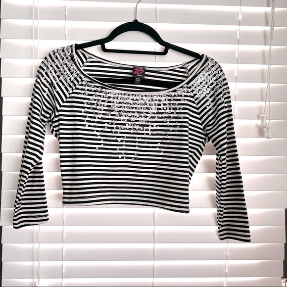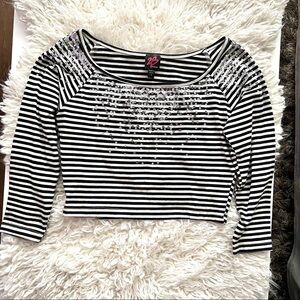2B, Bebe, Bebe crop top, Bebe sequin top, 3/4 sleeves, sexy Bebe top, black and white stripe top, Bebe style, summer styles, sexy crop tops, cute crop tops, sequin crop top,