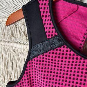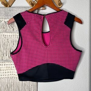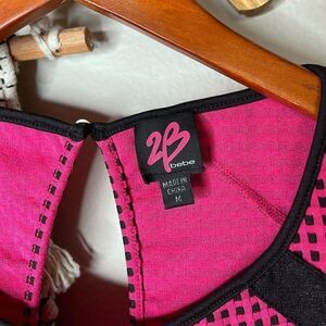 Bebe Pink & Black Mesh style Cropped Top size medium. Excellent condition. Stretchy. Keyhole back. Faux leather stripes across shoulders. Adorable with high waisted bottoms!