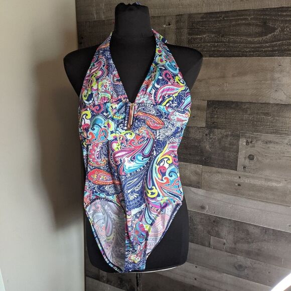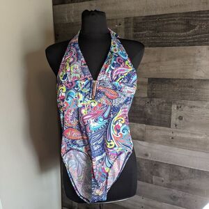 Nice halter style one piece. Removable padding to bust. freshly hand washed and air dried from smoke free home.