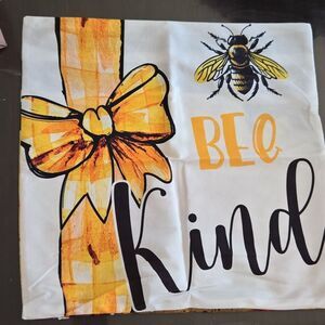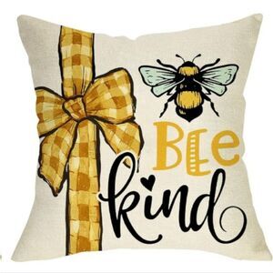 Charming decorative pillow with 'Bee Kind' design. Features a bee and bow in yellow and black.
