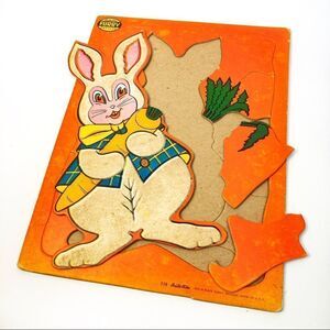 Inlaid cardboard puzzles featuring a furry bunny with a carrot and a furry bear playing the xylophone, by Built Rite Sta-N-Place.
