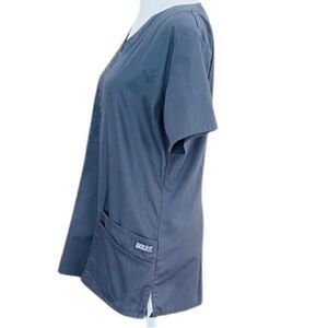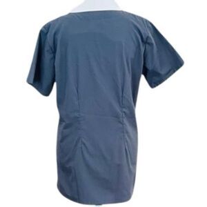 The gray top has tonal embroidery on one side of the front, v neck , 4 pockets, side slits. Approximate measurements are pit to pit 21”, length from shoulder approximately 26.5”. 65% polyester, 35% combed cotton.