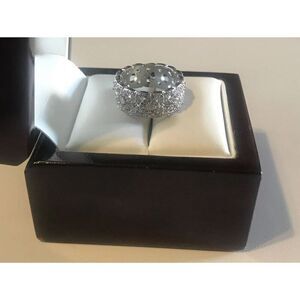This ring features two carats of shimmering pave set simulated diamond gemstones in a wide band. The top and bottom of the band is done in a scalloped design. The band and setting is done in a sterling silver plate and layered with rhodium for the look and durability of platinum. It is a size 7.