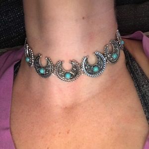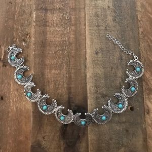 Beautiful boho antiqued silver plated choker with faux turquoise stones. Approx. 12" with approx. 2" chain extender. Brand new in bag.