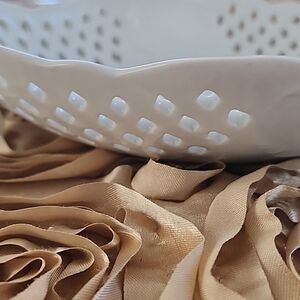 Two oval in shape, 9" x 7" x 2" decorative lattice cut work bowls with pretty embossed detail inside. Great for use at your next tea party, shower, reception or family gathering. Also pretty to place on the wall with a hanging kit.