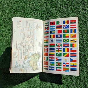 Atlas of the World featuring maps of the world's continents with the middle pages displaying all countries flags.