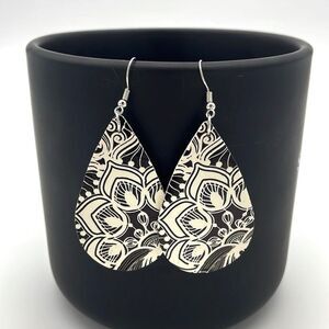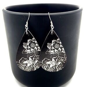 2 PAIR of Black and White Teardrop Leather Floral Design Earrings