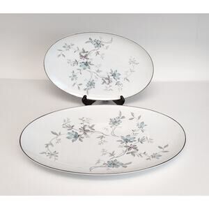 2PC Noritake LORENE 16" & 12" Oval Platter 5764 Blue Gray Floral Silver Trim.