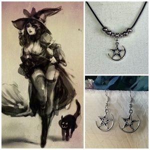 UNIQUE STYLES BOUTIQUE - New Two piece Celtic pentacle star black necklace silver bead pendant & dangle hook earrings bundle set. Very renessance gypsy tribal Wiccan Gothic emo vampire hipster punk magical magic vintage Iron Fist Dolls Kill Blackmilk Killstar Hell Bunny Hot Topic Hearts & Roses Betsey Johnson Lindy Bop Witch Retro Unlimited Sparkle & Fade Vena Cava rave Anne Funky People Forever 21 Lucky Brand Urban outfitters. ** More Designs go to "brand" under "Unique Styles jewelry set”