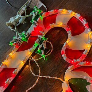 This sale is for 2 pieces of Christmas lighted Decor. There is a Vintage 2000 Impact Plastics Lighted Candy Cane Holiday Decoration in great working condition. And there is also a Santa Claus that is waving his hand and is also in great working condition. Please see all of my photos for the exact condition and measurements.