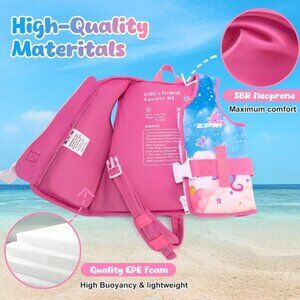 This children swim vest is made of the preferred materials for high-quality buoyancy aids and has an adjustable quick-release safety buckle, high-density nylon waist straps, and a full front zipper for easy wear. The bottom adjustable soft crotch strap and bottom safety buckle ensure a secure fit even when floating in water, enhancing safety