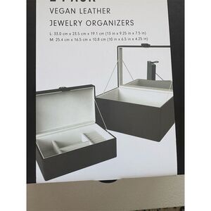 This jewelry organizer set includes two units made from vegan leather, featuring a built-in mirror for convenience. Ideal for organizing jewelry for any occasion, from casual outings to formal events. The product is in new condition. Keywords: jewelry organizer, vegan leather, built-in mirror, jewelry storage, organizer set, new condition, unbranded, casual, formal, vegan, mirror, storage, occasion, Leather.