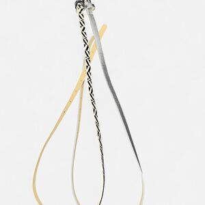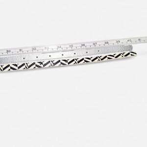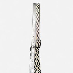 2 pack of skinny belts from Madden Girl - includes a cream and black geometric print belt AND a metallic silver belt.