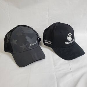 One structured black cap w/ houndstooth pattern, one camo gray/black mesh trucker