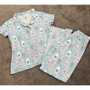 The 2-piece Munki Munki Champagne Bottles Seafoam Luxuriously Soft Short Sleeve Pajamas for women in size medium are the perfect blend of style and comfort. Made by the brand Munki Munki, these pajama sets feature a unique champagne bottle design in a seafoam color, adding a touch of fun to your bedtime routine. The short sleeves and soft material make them ideal for lounging around the house or getting a good night's sleep.