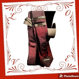 Gorgeous Murano Tie & Leather storage/travel non- wrinkle tie case. Murano Tie in Red/black high sheen, modern thin style. I buy these leather tie storage/travel, snap closure cases off Amazon ($17) specifically to go with sale of ties.