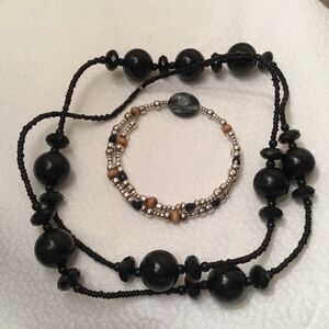this set includes a over-the-head style 30” necklace made up of seed beads, faceted rondels and larger approx. 12mm ball beads, all in black. And adjustable coil bracelet with silvertone, brown and black beads is also included. $8 set or bundle 3 of same price for $15 and save.