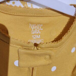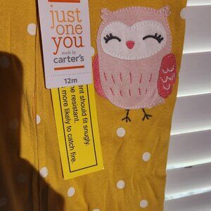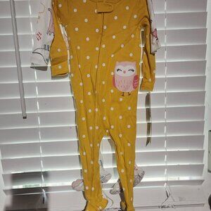 Made by Carters. Set of 2 brand new footed baby pajamas. Zipper front. One is gold with an owl and white polka dots. The other white with dinosaurs. Cotton. NWT. Size 12 months.