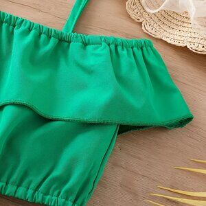 Get your little one ready for some fun in the sun with this adorable 2-piece girl's green off-shoulder blouse top and tropical shorts set. Perfect for holidays or casual outings, this outfit is a summer gift that will surely make a splash. The green bikini top and shorts feature a playful palm leaf print, adding a tropical touch to your child's wardrobe. The off-shoulder design of the blouse top adds a trendy flair, while the comfortable shorts allow for easy movement and play. Whether she's lounging by the pool or playing in the sand, this stylish ensemble is sure to keep her looking cute and feeling cool all season long. Perfect for any young fashionista who loves to stand out in style.