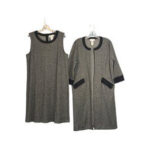 This elegant two-piece set exudes timeless sophistication with its houndstooth pattern and lightweight fabric. The sleeveless dress pairs beautifully with the coordinating open-front jacket, featuring chic black trim and functional pockets. Crafted for comfort and style, this versatile ensemble is suitable for various settings, offering effortless elegance and practicality.