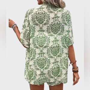 Upgrade your warm-weather wardrobe with this effortlessly stylish 2-piece summer short set featuring a breezy open front kimono-style shirt and matching high-waisted Elastic shorts in a fresh green botanical print. Crafted from 100% lightweight rayon, this set is perfect for vacation vibes, beach days, or easy brunch looks.