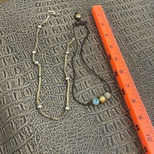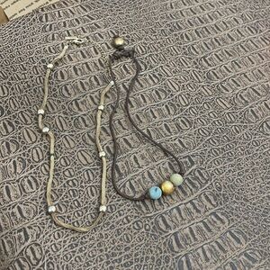 Set of two earthy necklaces featuring natural textures and tones, includes one beige cord necklace with silver tone beads and one dark brown cord necklace with three large natural stone beads in blue, gold, and cream. Adjustable lengths, lightweight and comfortable, perfect for layering or wearing solo, artisan vibe, handmade look, beachwear, casual boho style, earthy jewelry, rustic jewelry, festival accessories, cottagecore, boho core.