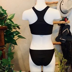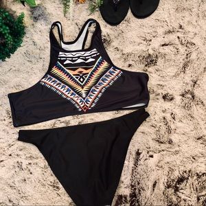 This 2-piece black bikini has a bright Aztec pattern on the front with a racer back tankini top.