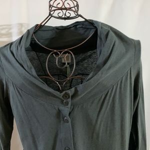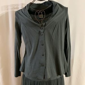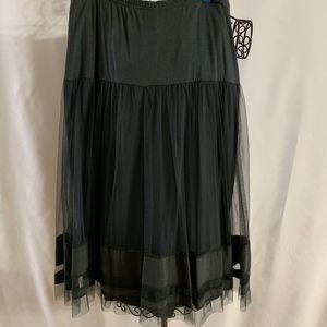 Long sleeve button front top with draped collar front look. Back dips longer than front with a peplum look with three tiers of tulle at center back. Skirt in knit has elastic waist with 8" yoke; tulle overskirt starting at yoke with knit bands at skirt bottom. Measurements: Top - pit-pit ft and bk - each 19 1/4"; 26" CB - 23" below 4 1/2" collar; 15 1/4" side seam. 19" inseam. Skirt: 31" waist, 20" hip Ft and bk; 23" skirt below 8" yoke; 65"bottom of knit underskirt. 80% cotton; 20% wool