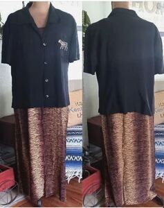 Unique 2-piece outfit featuring a sleeveless tiger print maxi dress with side slit and a short sleeve black button shirt overlay. The shirt includes a tiger embroidery on the chest and animal print buttons. Great for safari-inspired, retro, or eclectic styling.
