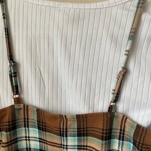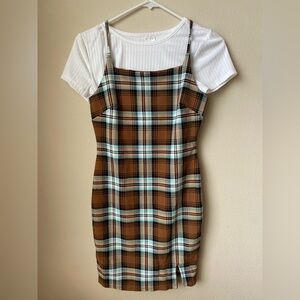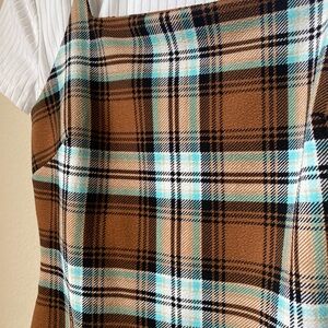 Chic plaid dress with brown, white, and blue tones. Ideal for casual wear. Easy to style and layer.
