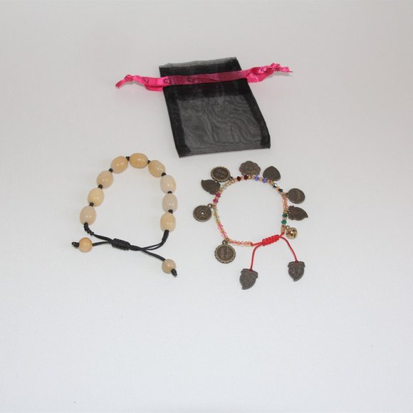 2-Pull Cord Healing Bracelets. Keep One. Gift One. Wear Them Both. Beautiful Honey Calcite Oval Beads with Double Knots Between on a Black Pull Cord That Adjust 5 ¾”-9 ¾” Inside Diameter-Weight 2 grams. Colorful Swarovski Crystals Between Inspirational Chinese Brass Charms and a Tinkling Bell on a Red Pull Cord That Adjusts 5 ¾” -8 ¾” Inside Diameter-Weight 16 grams. Symbols Translation: Long Life & Health, Wishful, Riches, Longevity, Luck and Go Live. Comes in Organza Pouch.