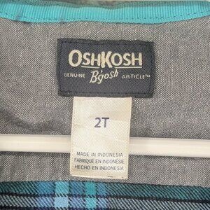 This is an OshKosh B'gosh toddler T2 boy's hooded, long sleeve, button-front flannel shirt or jacket in a blue and black plaid pattern. 100% cotton. It is used but in very good condition.