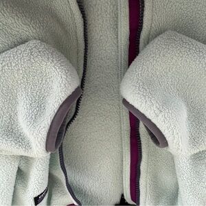 2T Patagonia Synchilla hooded fleece jacket. Light teal/mint green color with purple accents. GUC. Normal fleece wear. Smoke free household.