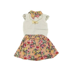 Beautiful and Elegant 3 piece baby set includes Collared Shirt with built in bow, detachable imitation pearl necklace, and an adorable floral skirt.