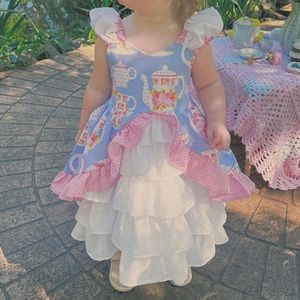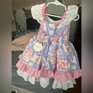 Worn once! *Pics on hanger are from before my daughter wore it, but it does not have any defects. It looks the same. Such a beautiful party dress! If your little one is having a tea party/birthday party, you need this dress! Dress is poofy at the bottom giving it such an adorable look! Amazing quality. Originally from PlayfulPrincessShop on Etsy! Make an offer!