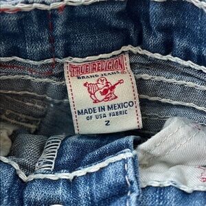 Classic blue denim jeans with distinctive stitching. True Religion branding on label.