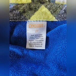 2T gymboree boys button down flannel, this flannel has a double layer and is thicker than a regular flannel and almost like a "shacket". The colors are black, blue, white, and a brighter yellow color.