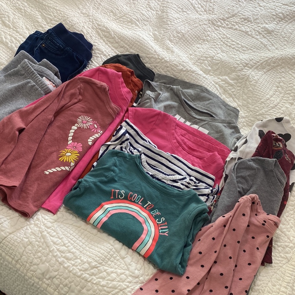 All in pretty excellent used condition. I couldn’t see any visible stains. Slightly noticeable fading in the maroon long sleeve. Bundle is mainly Cat&Jack and old navy. 8 long sleeve tops, 3 short sleeves, one fleece leggings in gray, and one jegging type pants, oh and a crew neck sweater.