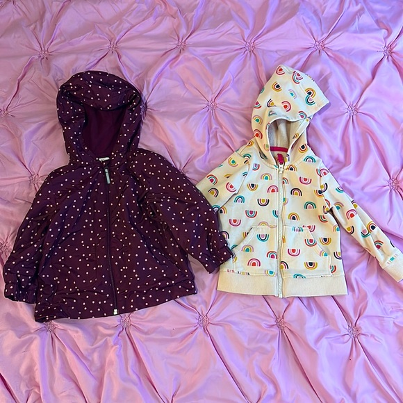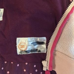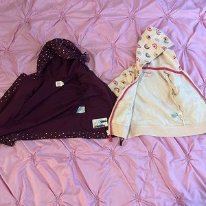 Purple polka dot jacket/windbreaker has no flaws except for inside markings on the “name tag” area. Rainbow hoodie has some pilling and normal signs of gentle use.