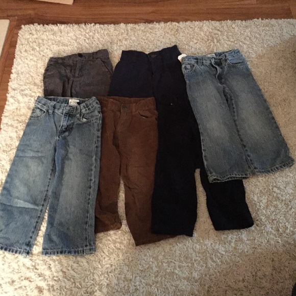 Six pairs of pants size 2T. 2 pair Children's Place jeans in bootleg. 2 pair Crazy 8 corduroy in navy and dark tan. One pair of Cherokee gray dress slacks. Oshkosh navy slacks still with tags never worn. All except Oshkosh have adjustable waist band. Gently used condition