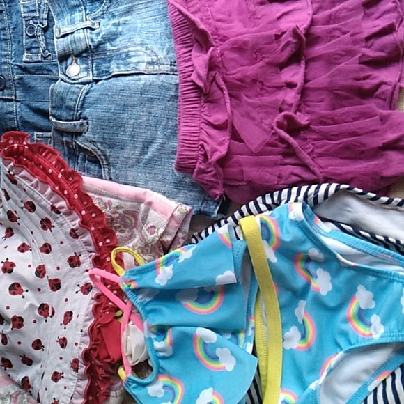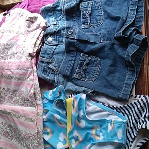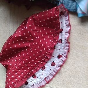 All in excellent shape , rain bow bikini is new never worn, reversible lady bug sun hat, 2 pair Jean shorts