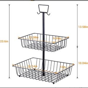 Black metal basket with two tiers. Ideal for organizing various items.