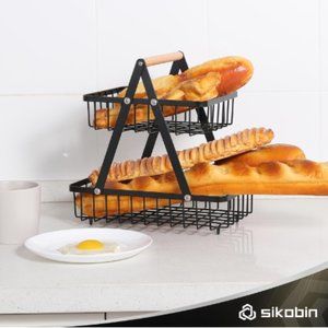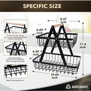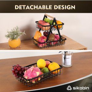 Sikobin: 2-Tier Countertop Metal-Wire Fruit Basket - Portable Fruit/Vegetable Basket Bowl for Kitchen Counter - Fruits/Vegetable Stand Holder Organizer - Bread/Snacks Storage (Black)