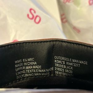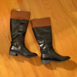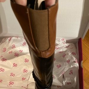 Tall Riding-Style Boots- SO Brand from Kohls. 2- tone- a rich, pretty caramel color top, and black lower part of boot. Very stylish boots- versatile— can be styled with so many different outfit options - business casual, or a weekend stroll with leggings and your over-sized sweater, to your fave skinny jeans and sweatshirt. The back of the tan/caramel calf section has a stretch elastic material to expand if needing more stretch room- see photos. A wrap around belt with 2 buckles feature around the ankle area- very chic' and cool. Boots are slip-on, but also have a zipper around bottom leg area if needing more slip-on leverage room. Style: Trixie, Size: Women's 8.5. Upper: Man-made. Lining: Textile/Man-made. Sock Lining: Man Made. Outer-sole: Man-made. Brand new in original box- will ship in original box packaged and wrapped with care. Photos part of description. AS-IS from retailer, may have minor scuffs or markings- photos part of description. Please ask any ?'s. Pet free/smoke free home. Open to offers.