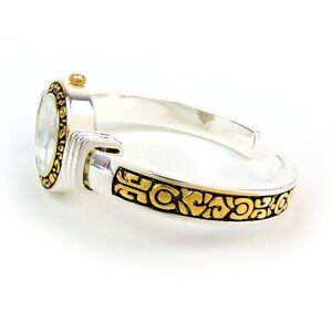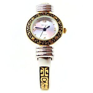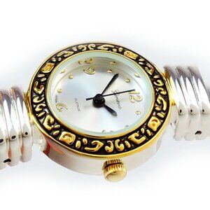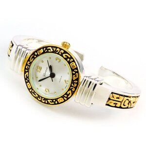 Beautiful Western Style Bangle Cuff Watch by STC. The band is about 0.25 inches (8 mm) wide that will open to fit all wrists from 6.5 to 7 inches. Case Diameter is about 19mm, The surrounding case is polished finish and has a white round dial with black hands.